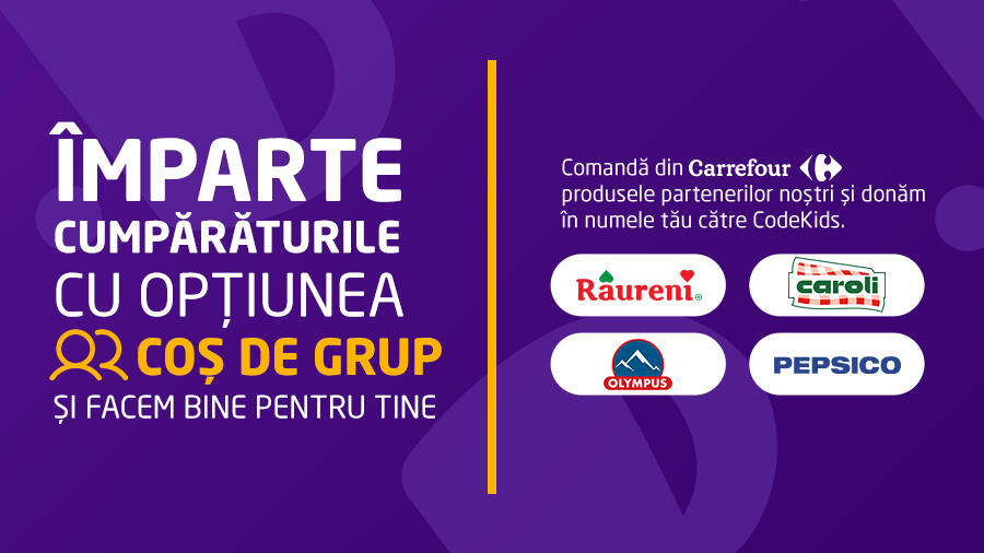 b) Sa achizitioneze din Magazinul Participant mentionat in Sectiunea 2 a prezentului Regulament, Produse Participante pe Perioada de Activare in valoare de minim 70 de lei pe o singura comanda, si beneficiaza de livrare gratuita din Carrefour hipermarket, iar la folosirea optiunii “cos de grup” organizatorii fac o donatie de 10 lei in contul Fundatiei Progress, pentru proiectul CODE Kids.